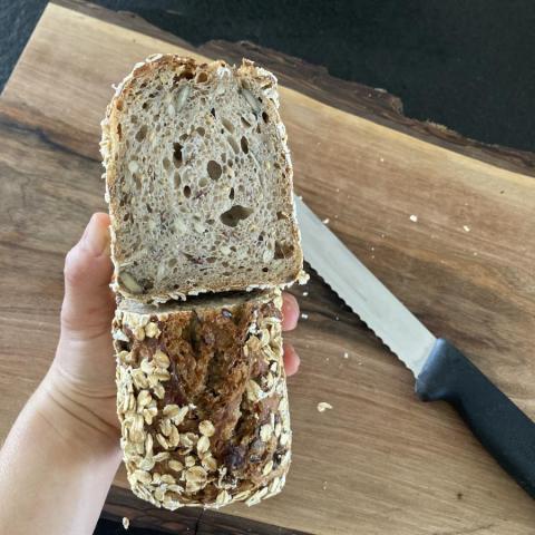 Petit pain fermenté au levain, enrichi en graines et flocons d'avoine. Il est moelleux et riche en arômes, idéal pour le petit déjeuner par ses apports nutritionnels.