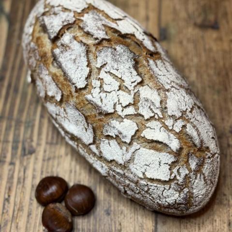 Farine Blé T80 meule de pierre (78%), farine de châtaigne (22%) eau, levain de blé, éclats de châtaigne, sel de Guérande