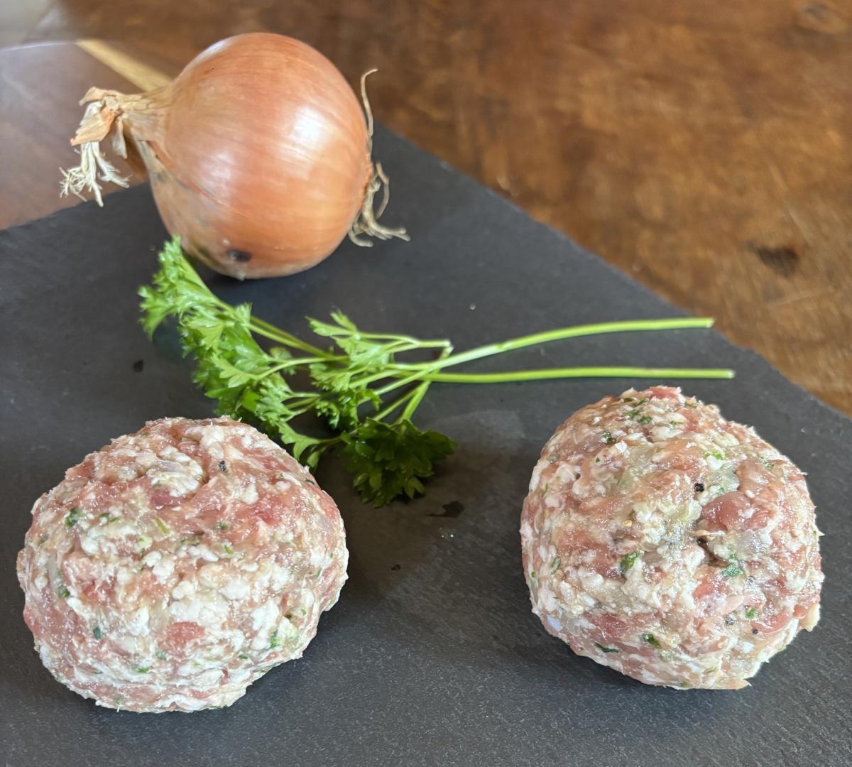 2 boulettes épice avec la recette de la farce à tomate fabriquées avec une recette maison et uniquement avec les produits de nos porcs, sans conservateur. Éleveur depuis 3 générations, ma famille m’a transmis l’importance de faire des produits de qualités dans le respect de la nature.