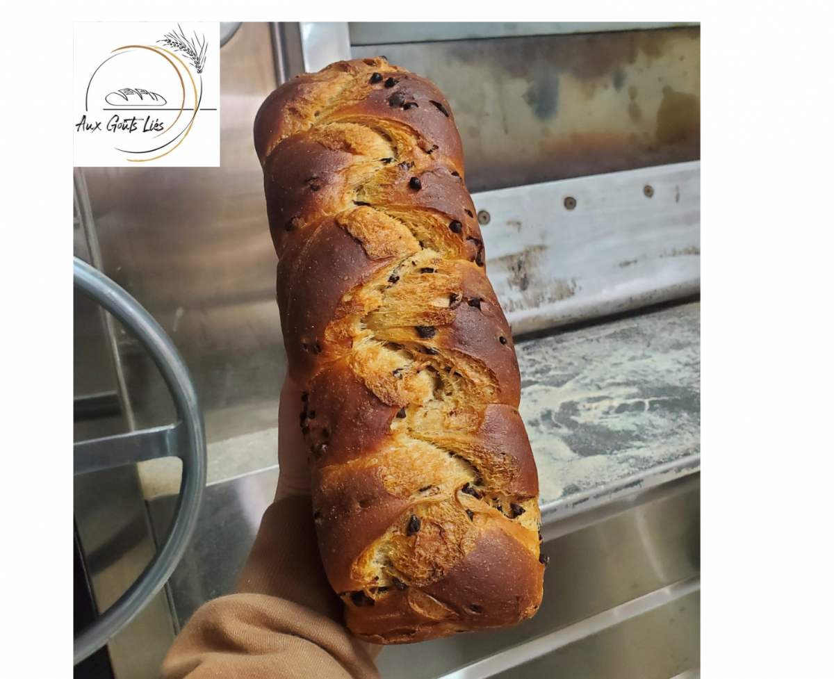 Brioche pur beurre, aux oeufs entiers plein air locaux, agrémentée de pépites de chocolat noir et fabriquée à partir de notre farine fermière bio.