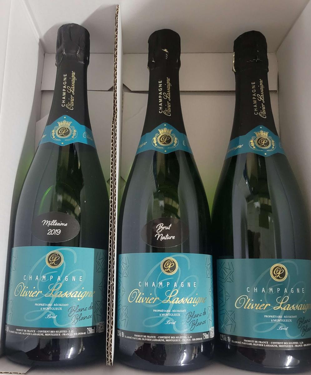 Champagne Olivier Lassaigne Blanc de Blancs brut, brut nature et millésime 2019 en coffret de bouteilles de 0,75cl .