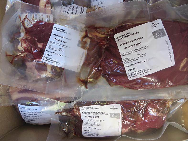 Le colis regroupe différents types de morceaux de viande bovine : filet (petits morceaux ou tournedos), rosbif (tranches ou rumsteak), rôtis (paleron, macreuse, jumeau,...), biftecks (tranches, rumsteak, faux-filet), pot-au-feu (jarret, plat de côte,...), bourguignon,...