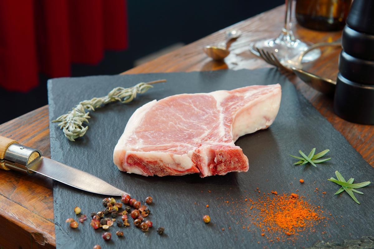 2 Côtes filet issus de nos porcs, la viande reste tendre car nous laissons le temps nécessaire aux animaux pour avoir le persillé qui donnera toute la saveur à la viande.