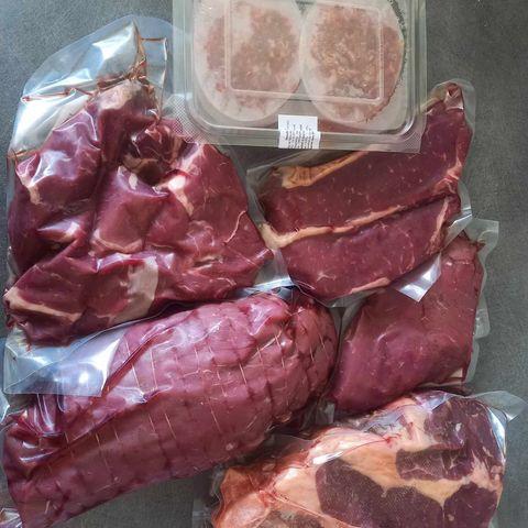 Le colis de viande de buffle en 5kg est constitué: d'environ un kilo de bourguignon, d'environ un kilo de pot au feu, de 500g de chair à saucisses, d'un kilo de faux filet ou d'une cote de boeuf, de 700g à 800g de bifteck ou d'un roti et de 500g de steak haché.
