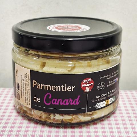 Parmentier de canard : purée de pomme de terre, viande de canard.. Produit prêt à consommer, il suffit de le réchauffer 2min30 au micro onde ou 20 min dans un four à 180°C.