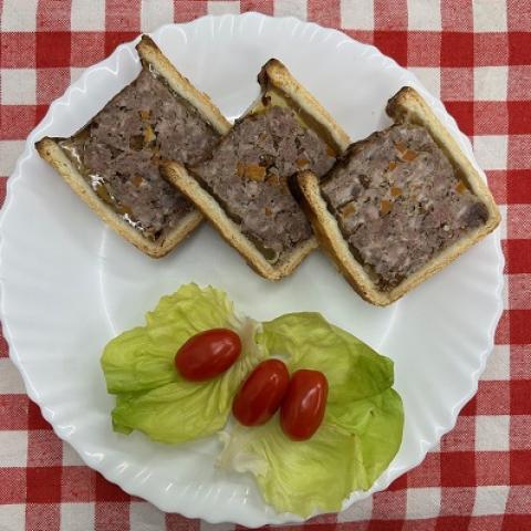 Viande de sanglier marinée vin épicé et sous forme de camembert. Entre jambon et saucisson.