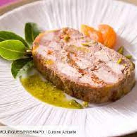 Pintade, gras de porc, oeuf , sel, poivre, abricot, porto