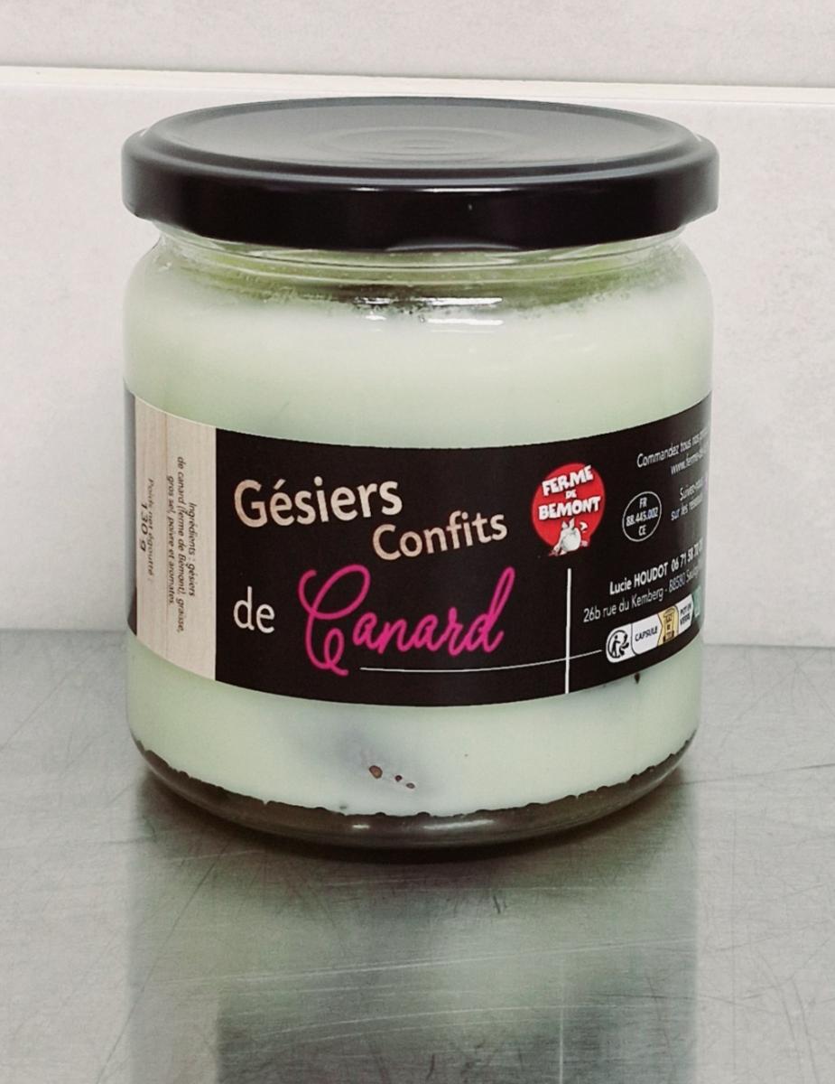 Bocal de 5 gésiers confits. Mettre le bocal dans l'eau chaude pour liquéfier la graisse. Sortir les gésiers, les trancher et les faire revenir à la poêle. A servir chaud sur une salade verte. Conserve