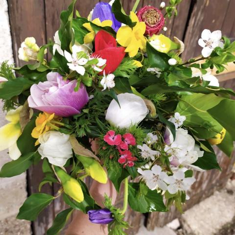 Exemple de fleurs : renoncules, tulipes, oeillets de poète, Delphinium, matricaire...