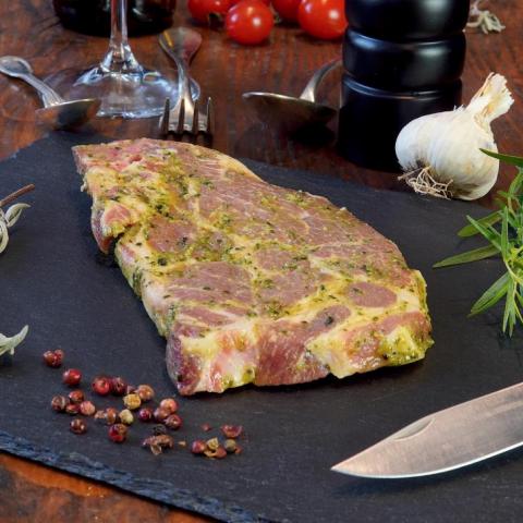 Poitrine marinée issus de nos porcs, la viande reste tendre car nous laissons le temps nécéssaire aux animaux pour avoir le persillé qui donnera toute la saveur à la viande. La marinade étant déjà au contact de la viande, elle va permettre à la viande de récupérer toutes ces saveurs. Et vous aurez juste à vous occupez de la cuisson et savourer.
