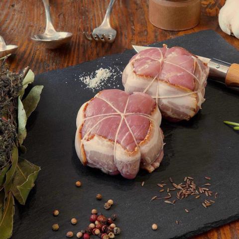 Rôti Orloff issu de nos porcs, la viande reste tendre car nous laissons le temps nécessaire aux animaux pour avoir le persillé qui donnera toute la saveur à la viande.