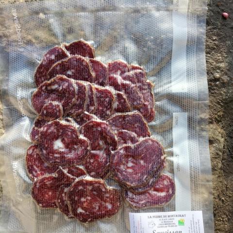 Saucisson tranché pur porc fabriqué à partir des porcs Bio élevés sur notre exploitation .