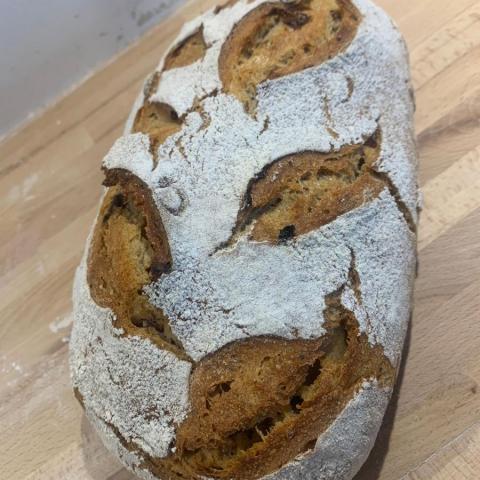 Farine de Blé tendre (Automne Rouge Barbu), Farine de Seigle (variété Brotchampagner), Raisins secs, Noisettes, Levain, sel, eau.