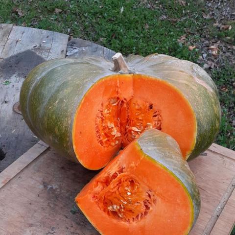 La tranche pèse entre 450g et 600 g ,sa chair orange flashy, rouge cuivré, très dense, épaisse, offre un goût sucré, légèrement musqué