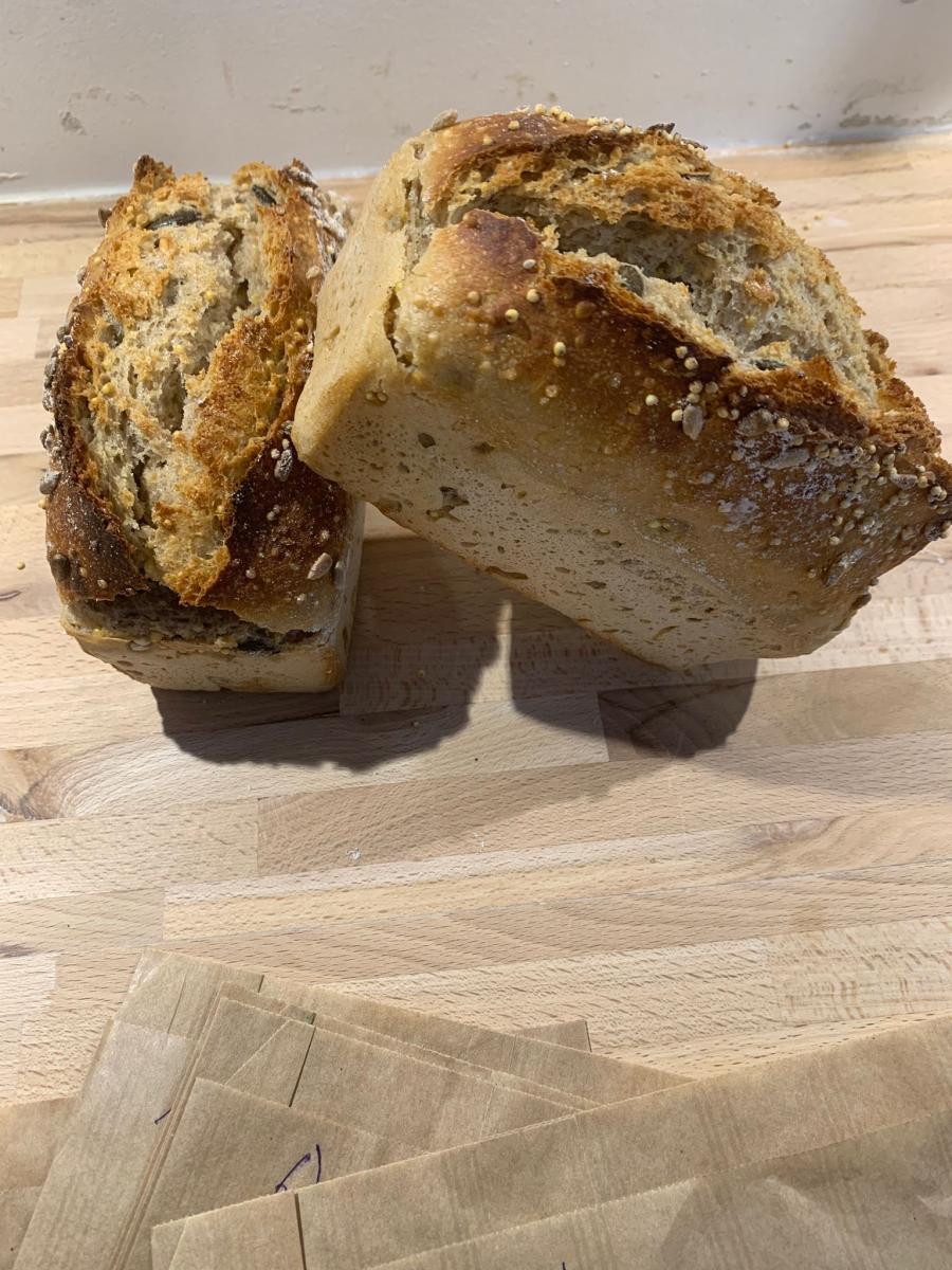 Farine de Blé tendre (Automne Rouge Barbu), Farine de Seigle (variété Brotchampagner), graines
