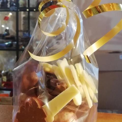 Assortiment 175g de chocolats et confiserie : une guimauve chocolat, un croq'amande, un rocher, des mendiants, des pralinés, une pâte de fruit et des orangettes. A conserver dans un endroit frais et sec. Présence de gluten et fruits à coques et lactose