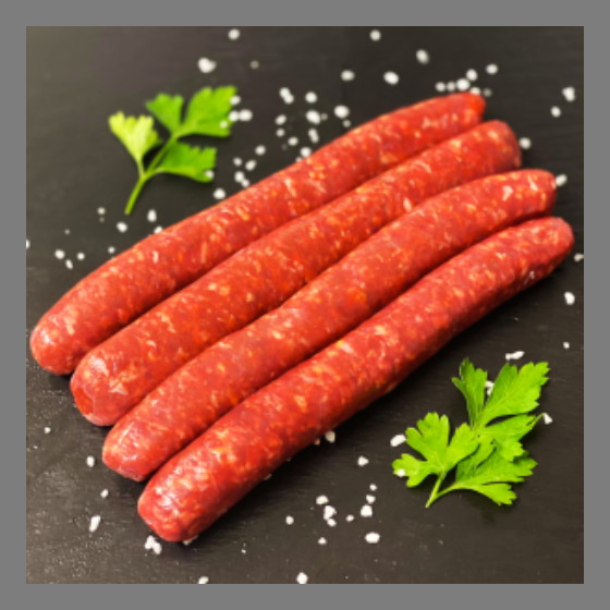 Ingrédients: viande de bœuf, boyau de mouton, épices à merguez (sel, sirop de glucose, dextose, acidifiant E62, 1,9% aromes naturels, huile de tournesol, plante aromatique antioxydant E301, colorant E12O).