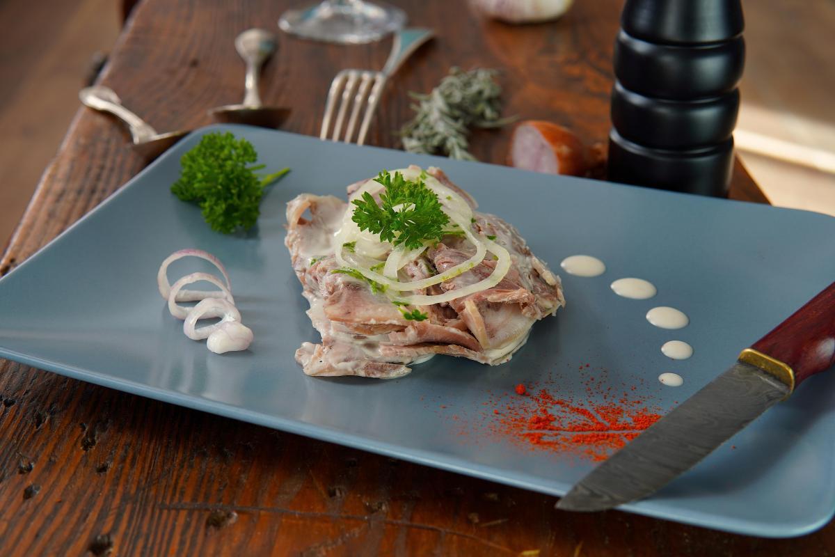 Ingrédients: Tête porc, jus cuisson, gélatine, muscade, oignons, vinaigrette.