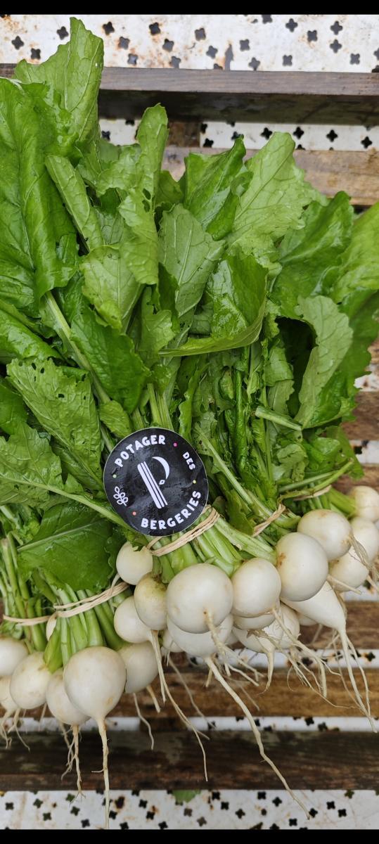 Navet nouveau de couleur blanche à la saveur douce et légèrement moutardée. Se déguste également cru comme le radis. Un produit qui réconcilie tout le monde avec le navet! Vendu en botte, le feuillage se consomme tombé à la poële.