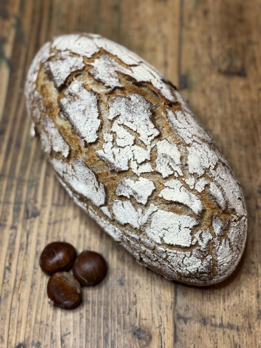 Farine Blé T80 meule de pierre (78%), farine de châtaigne (22%) eau, levain de blé, éclats de châtaigne, sel de Guérande