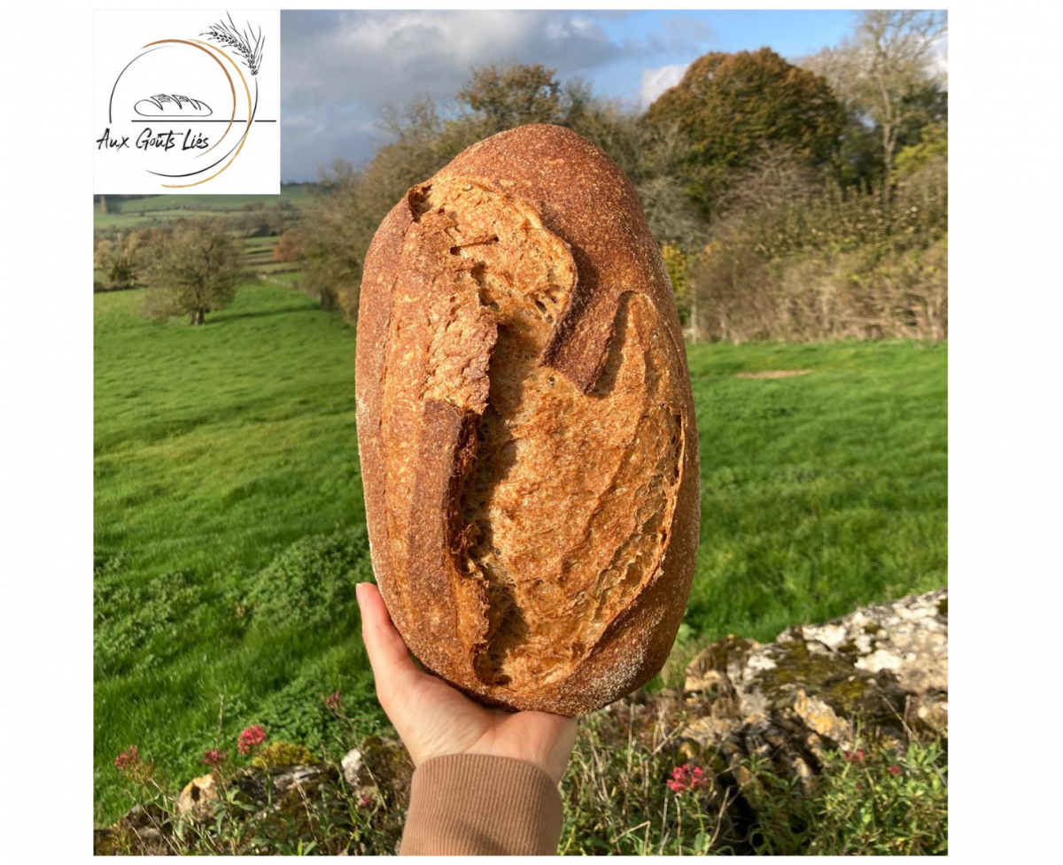 Pain au levain, farine fermière bio type 80 moulue sur meule de pierre, enrichi en son de blé issu de la mouture.