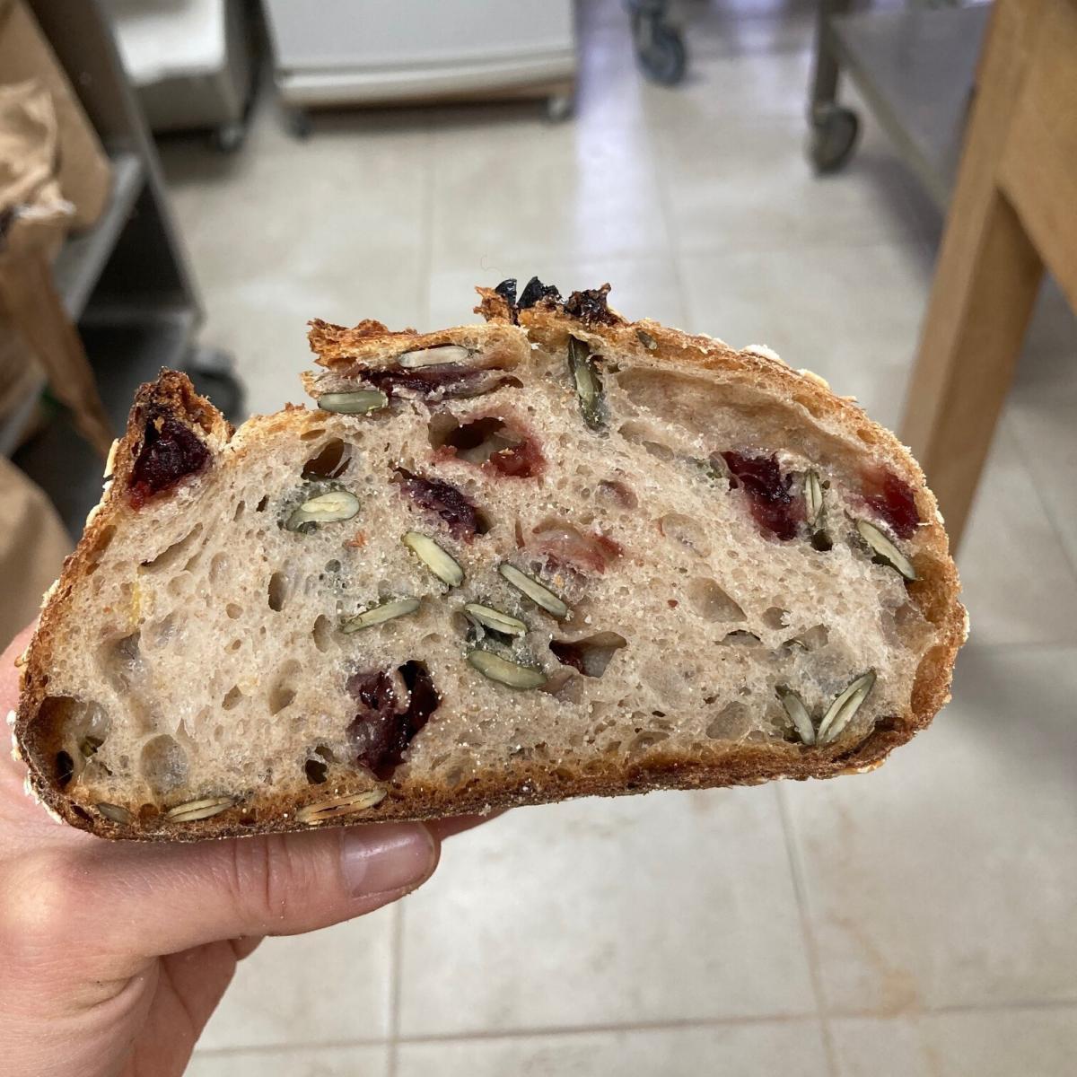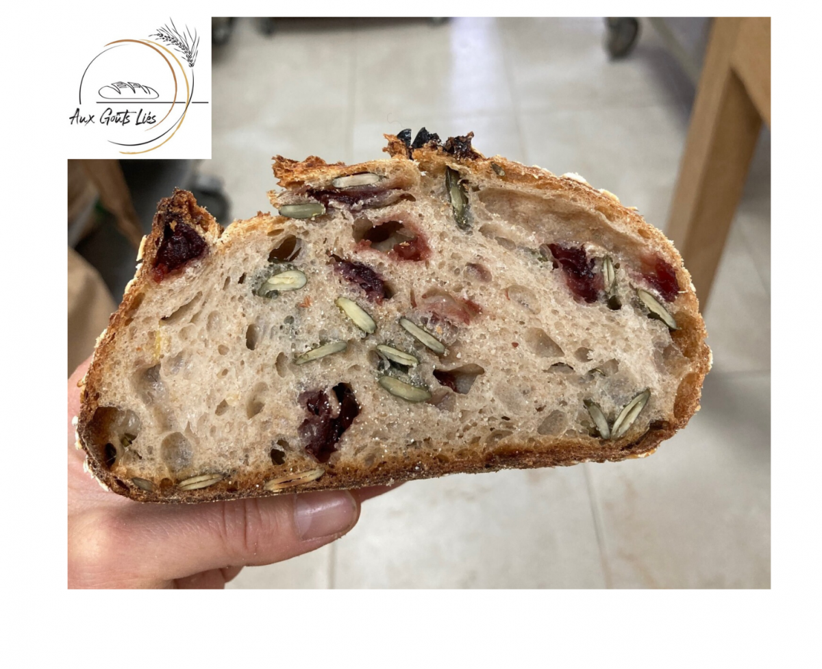 La pâte est enrichie en flocons d'avoine, cranberries et graines de courge.