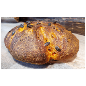 Farine Blé T65, eau, levain de blé, potimarron, curcuma, sel de Guérande
