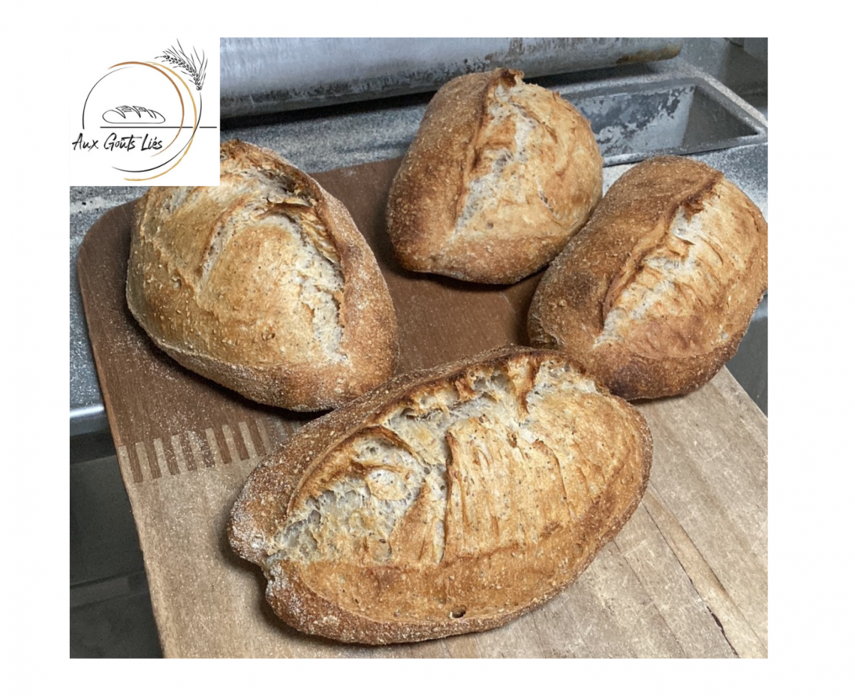 Pain au levain fabriqué à partir de notre farine fermière bio type 80 moulue sur meule de pierre, enrichi en graines de lin et de tournesol certifiées AB.