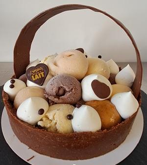 Composition : chocolat, feuilletine, praliné, sorbets aux fruits, et de glace, et chantilly