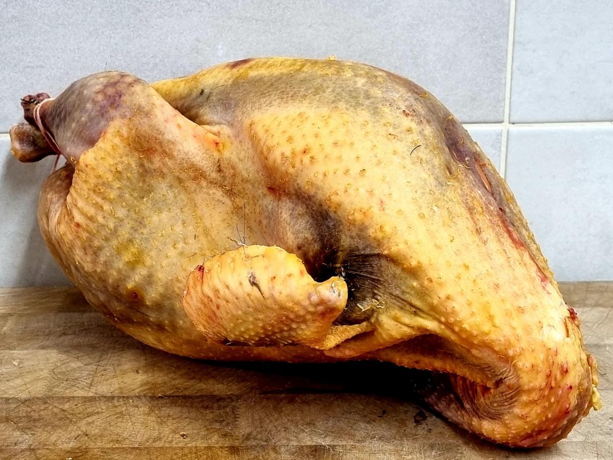 Volaille élevée à la ferme. Une pintade de 2kg est prévu pour 6 personnes. Elle est présentée entière, vidée, avec les abats et elle est prête à cuire. Comptez 2h pour la cuire au four ou en cocotte avec par exemple du choux et des carottes.