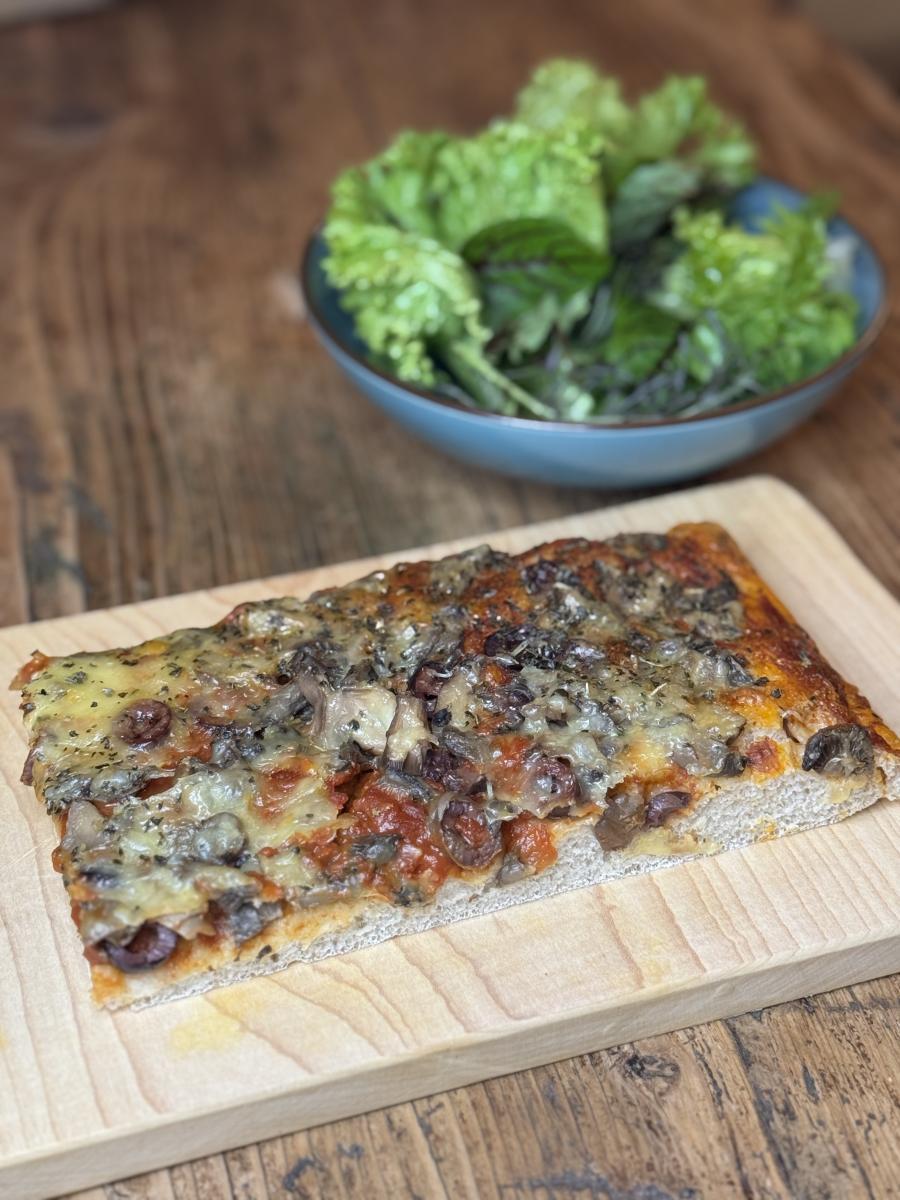 Garniture: sauce tomate, oignons, champignon, emmental, olive noire, origan