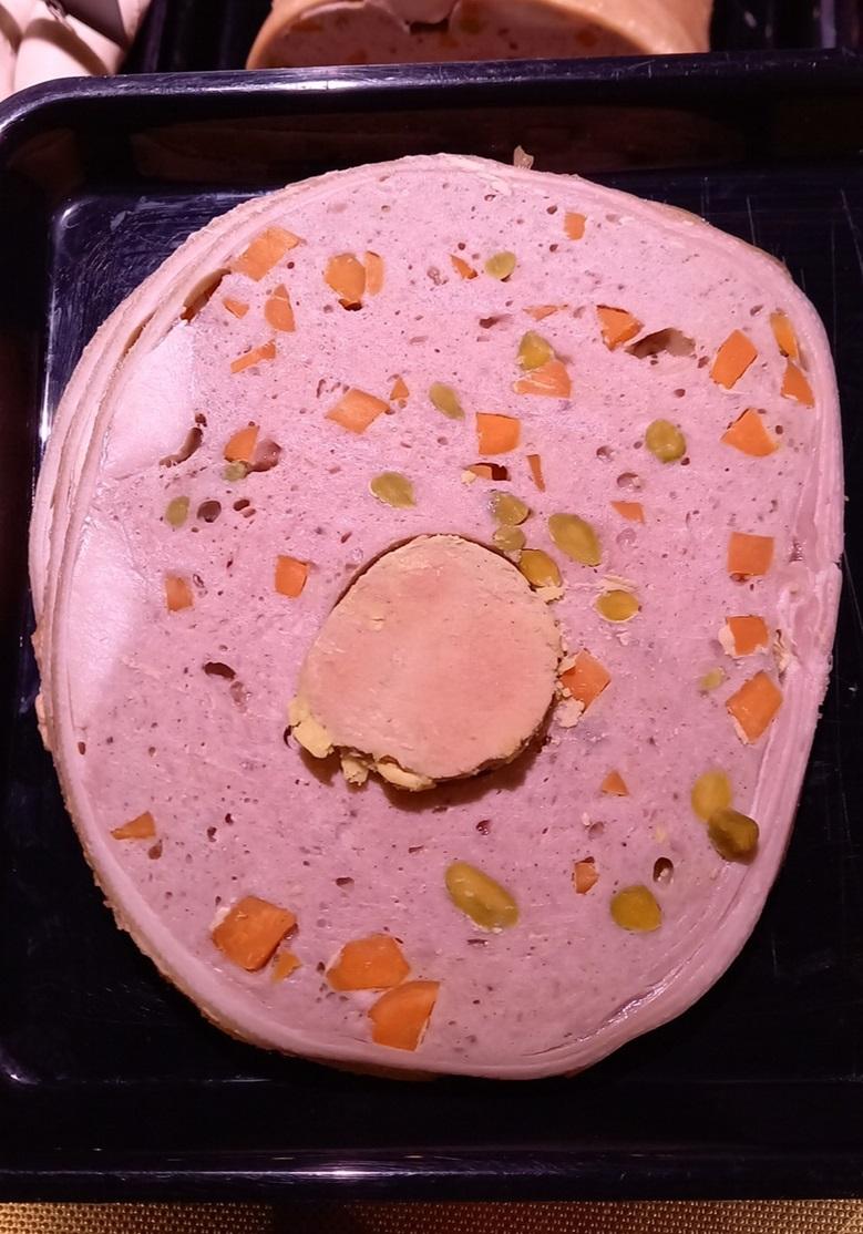 porcelet farci avec une farce fine, des pistaches et un médaillon de foie gras maison