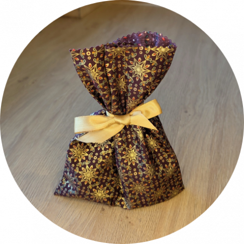 Nouée avec un ruban en tissu doré, cette pochette peut contenir 3 à 4 de nos savons et peut ensuite être réutilisée pour un nouveau cadeau ou pour ranger du petit matériel !