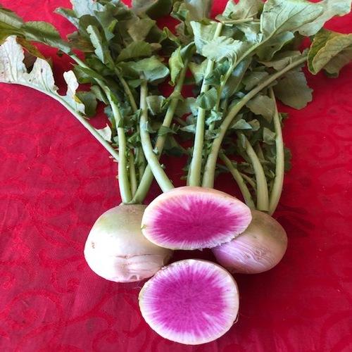 Radis de la taille d'un navet moyen, il est d'une jolie couleur vert amande à l'extérieur et d'un magnifique rose fushia moucheté de blanc à l'intérieur