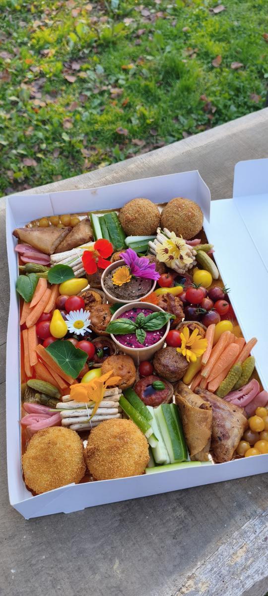 Inclus : 2 pots de Tartinable (humous, caviar d'aubergine, ...) avec gressins, pickles de légumes et bâtonnets de crudités du moment + 4 préparations chaudes par personne ( Samoussa aux légumes et fromage // Arancini aux Cèpes ou au Pesto // Muffins aux légumes // Mini Tartelettes aux légumes)