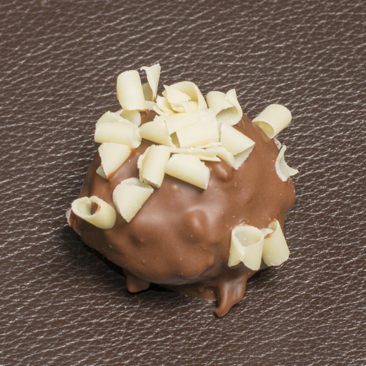 Composition: Beurre de cacao 38% minimum LAIT entier en poudre, poudre de LAIT écrémé, matière grasse de LAIT, sucre, beurre de cacao, émulsifiant : lécithine de tournesol, Praliné : AMANDES, NOISETTES, huile d’AMANDE raffinée, lécithine de SOJA, arôme vanille.