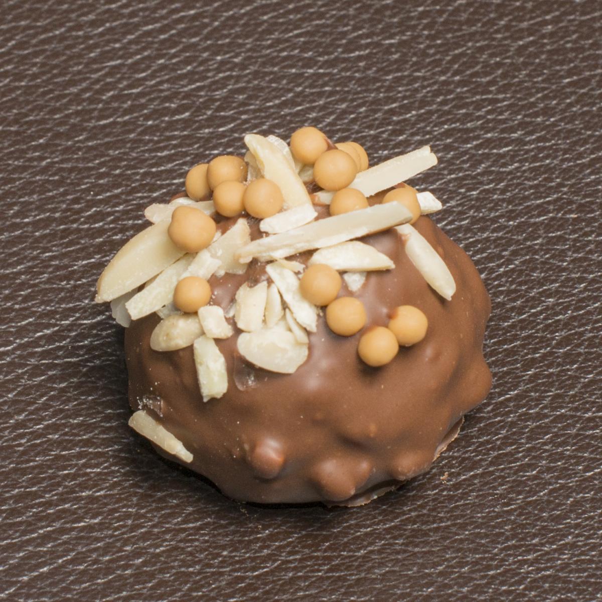 Composition: Beurre de cacao 38% minimum LAIT entier en poudre, poudre de LAIT écrémé, matière grasse de LAIT, sucre, beurre de cacao, émulsifiant : lécithine de tournesol, Praliné : AMANDES, NOISETTES, huile d’AMANDE raffinée, lécithine de SOJA, arôme vanille.