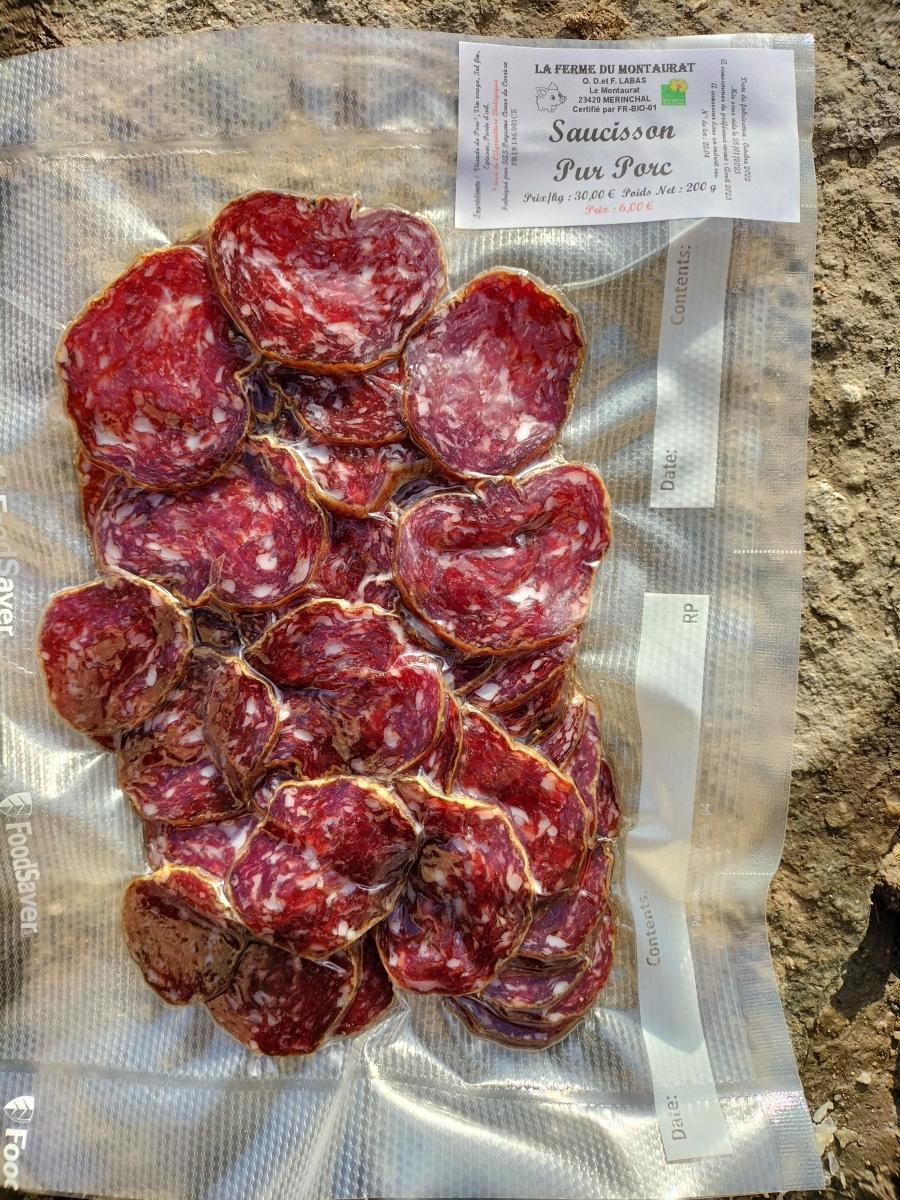 Saucisson tranché pur porc fabriqué à partir des porcs Bio élevés sur notre exploitation .