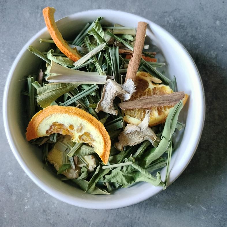 Composition : Citronnelle, orange, verveine, gingembre, cannelle