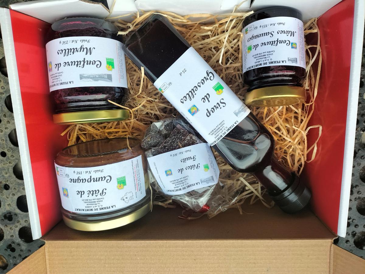 Valisette-cadeau en carton contenant : 1 confiture de Myrtilles de 250 g, 1 confiture de Mûres sauvages de 125 g, 1 sirop de Groseilles 25 cl, 1 sachet de pâtes de fruits de 100 g et une terrine de pâté de campagne de 180 g.