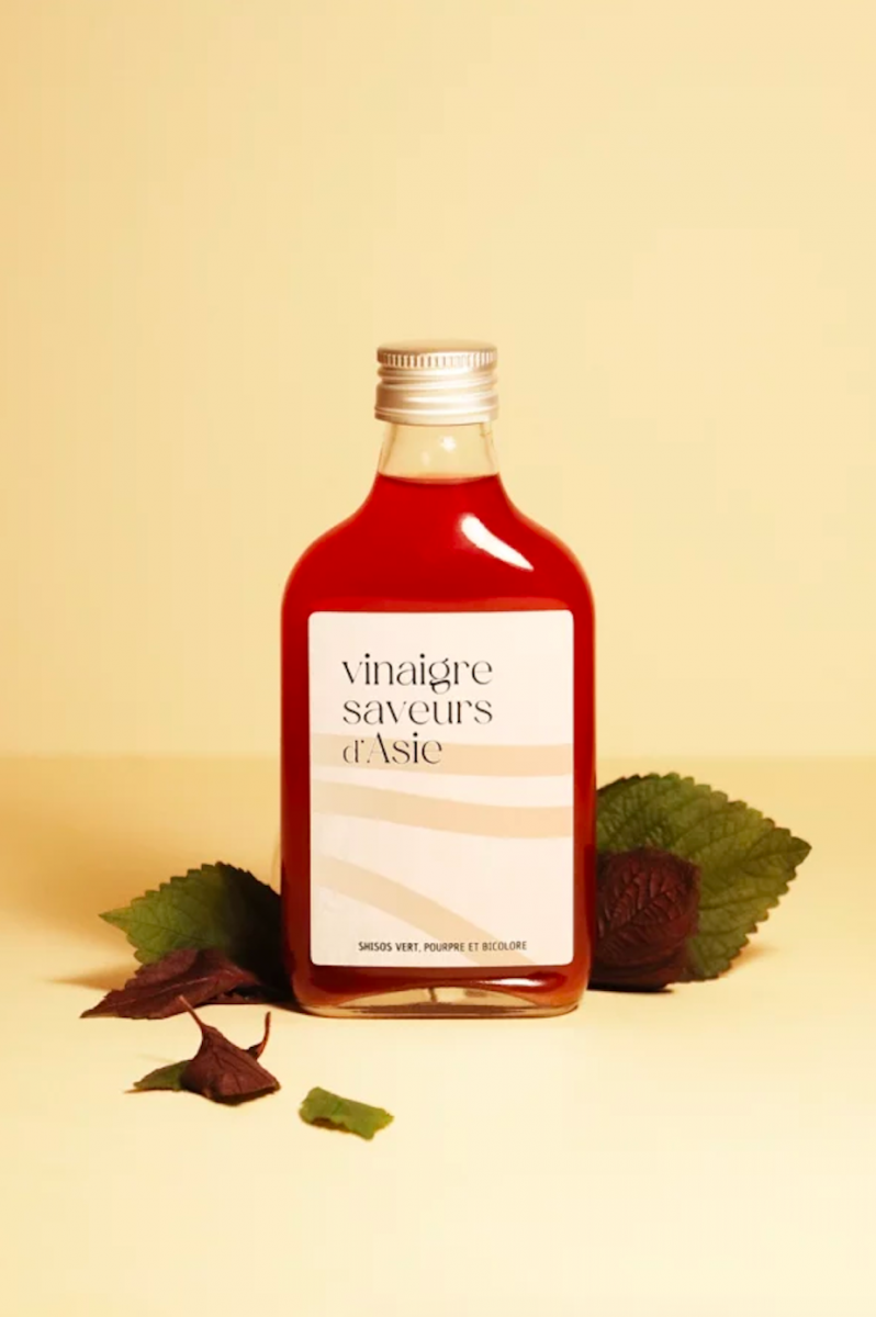 Vinaigre au shiso, plante asiatique aux saveurs herbacées et épicées, idéal pour une cuisine inventive et parfumée.