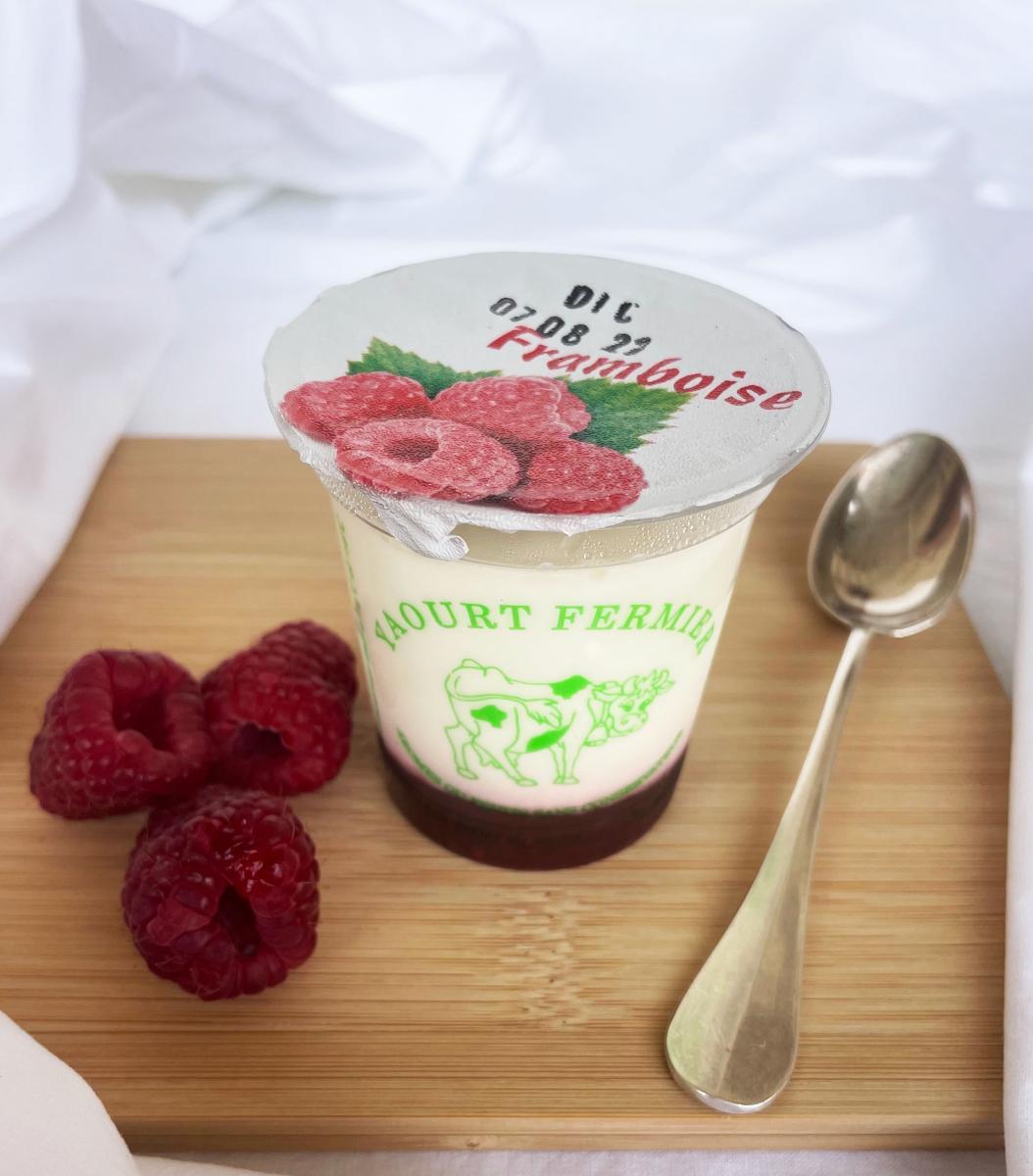 Yaourts fermiers de la ferme Gillot au lait entier pasteurisé de vache. Yaourt étuvé sur lit de framboise bio.